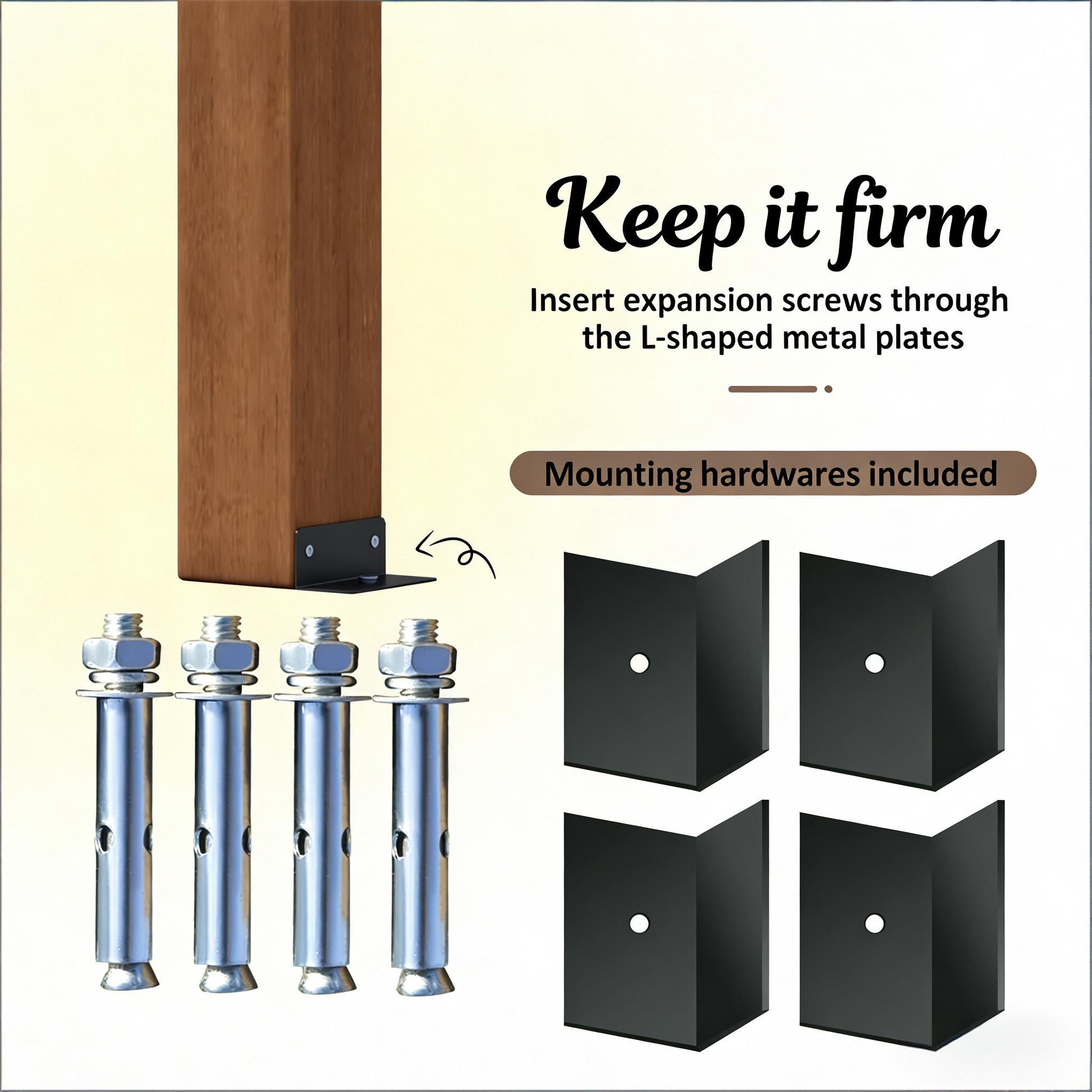 - For unshakable stability, the pergola includes strong expansion screws and sturdy metal L-plates, ensuring a safe and secure installation on hard surfaces like concrete or stone patios.