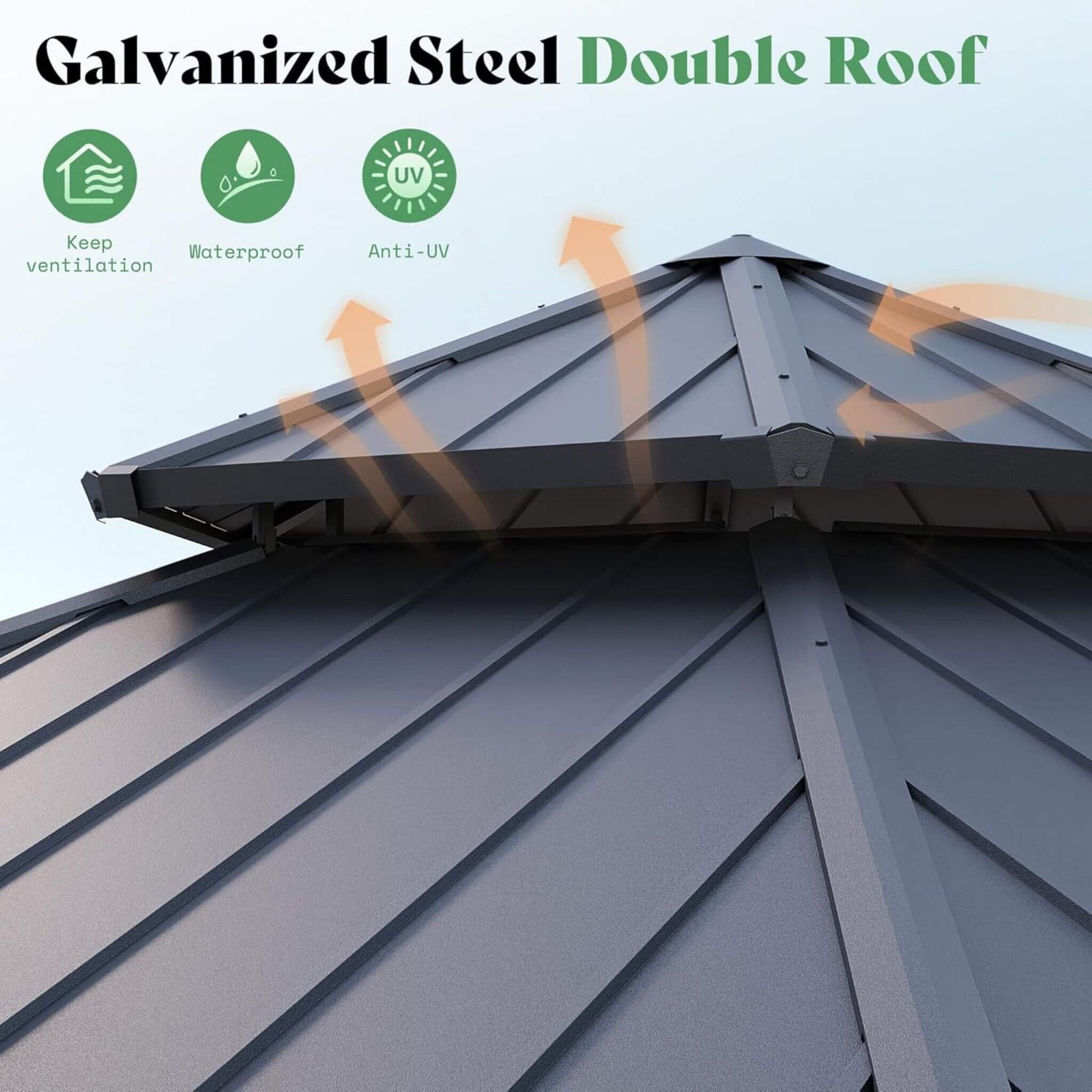 - Built with a rust-resistant aluminum frame and a double-tier galvanized metal roof, this gazebo is designed to withstand rain, wind, and sun. The ventilated roof boosts airflow and stability, making it a perfect year-round outdoor getaway.