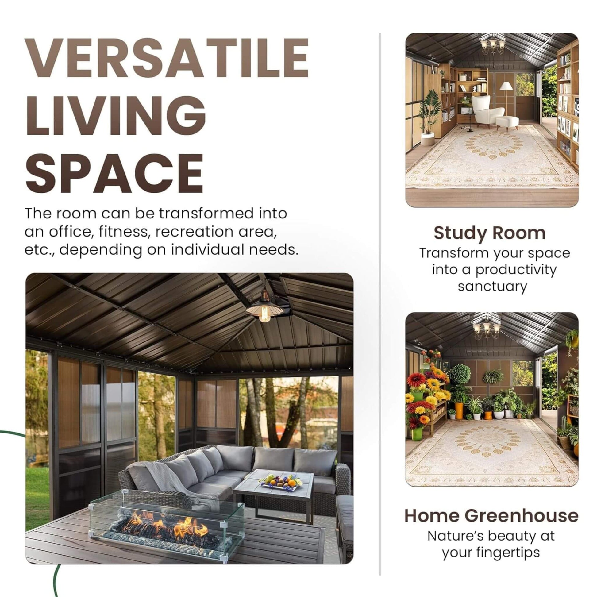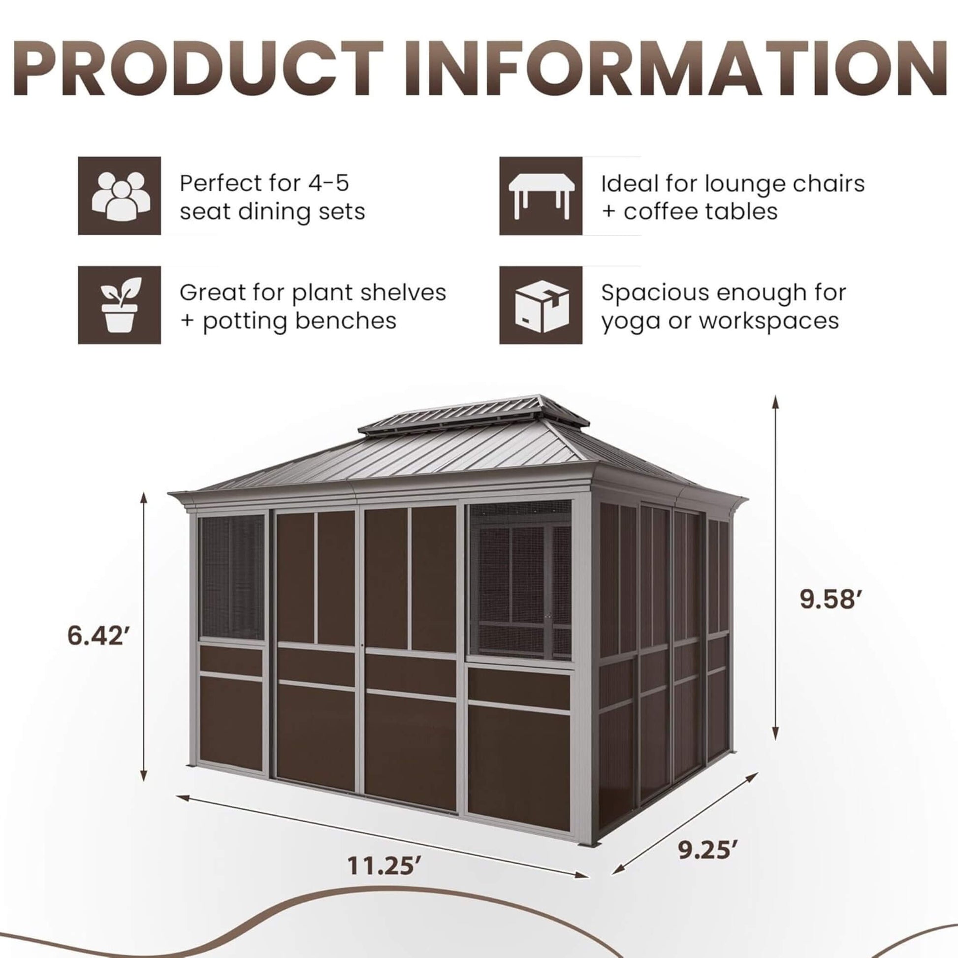 - This gazebo offers a spacious and multi-functional design, perfect for transforming your patio into a dining area, relaxing lounge, yoga studio, or even a greenhouse for gardening enthusiasts.