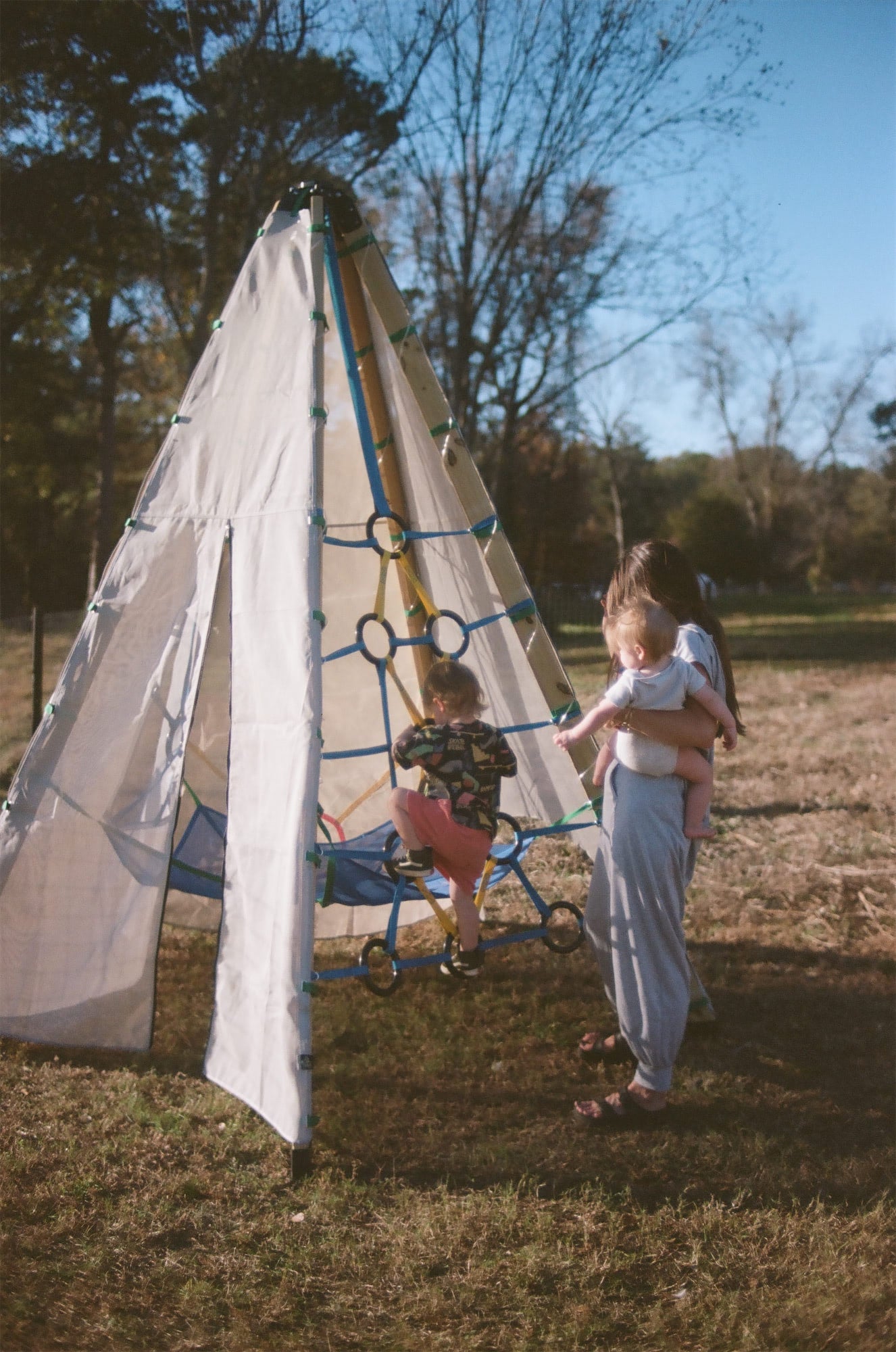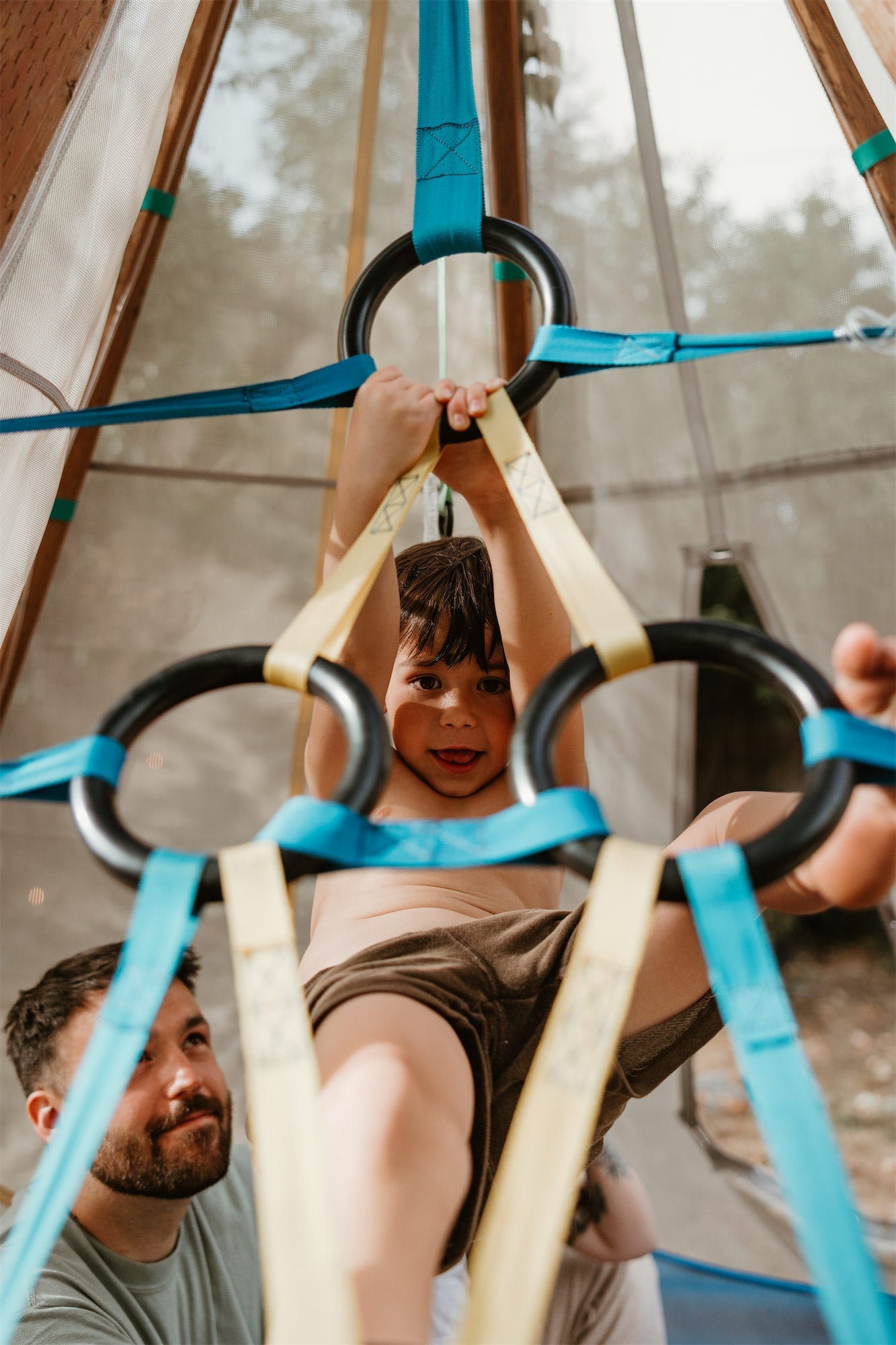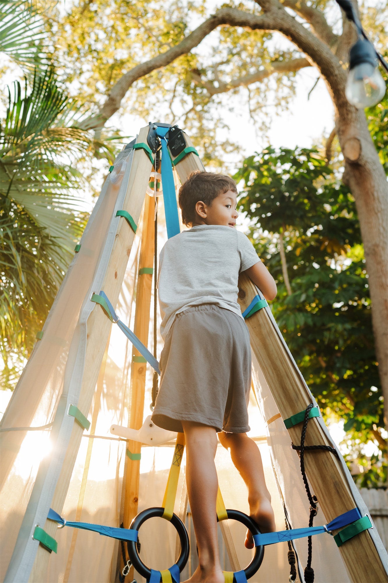 Bijou is a revolutionary collapsible play system that can quickly expand and adapt to your family's needs. It also has the strength to withstand harsh outdoor conditions, allowing it to remain up 365 days a year. It is crafted from powder-coated steel, UV-resistant recycled water bottle panels, and stainless steel hardware. It supports up to 250 lbs. and is designed for ages 3+.