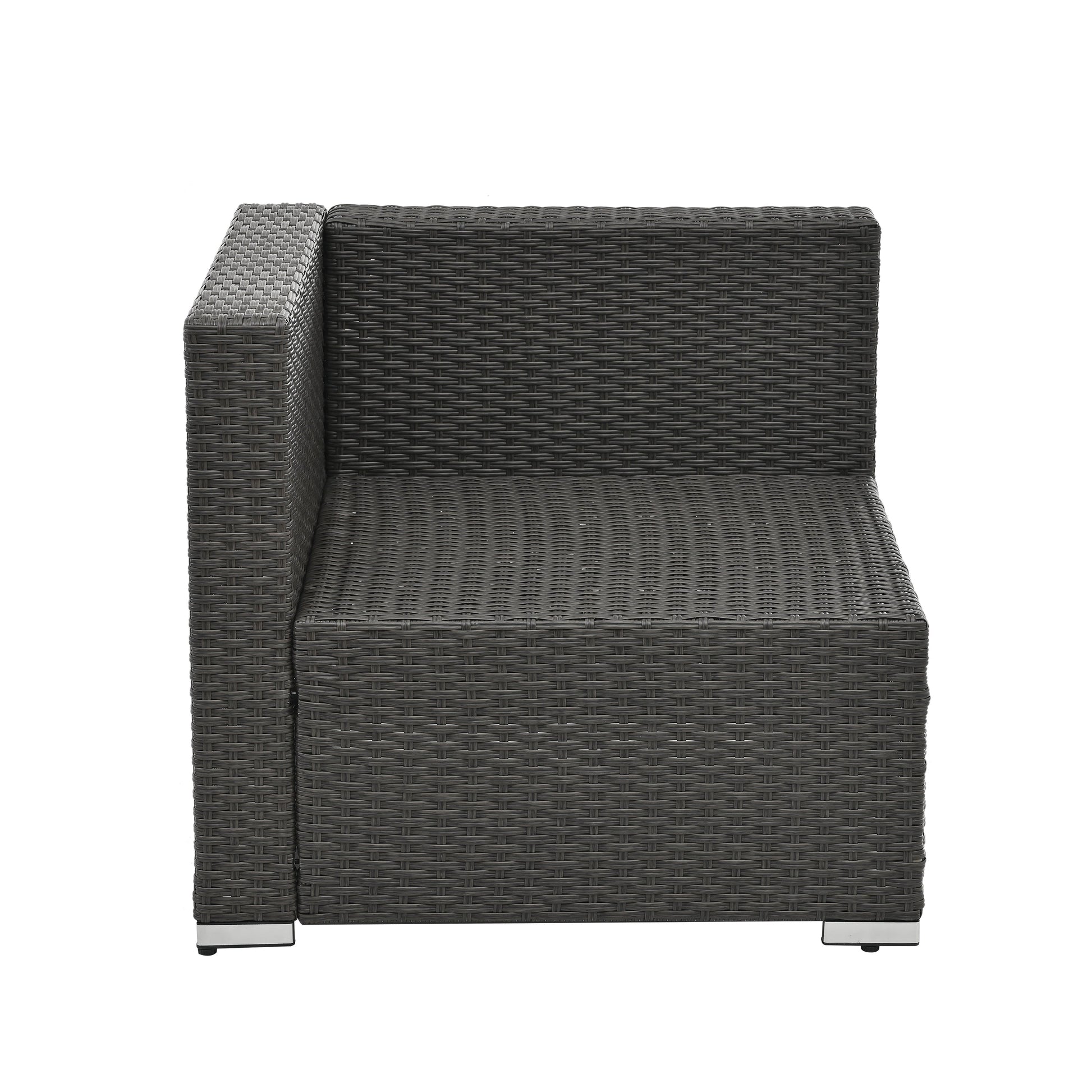 The frame is made of square metal tube, with PE wicker rattan, Hand woven. the cushion stuffing is polyester fiber, it can support long time crash. The table top is 5mm Tempered Glass. Specifications: Color: Dark Grey Material: Tempered Glass, PE Wicher, Metal Tube, Plastic End Cap. Product Dimensions: Single Seat: L23.62xW28.75xH25.40 Inches Conor Seat: L28.75xW28.75xH25.40Inches Table: L25.80xW25.80xH13.60 Inches Weight: 158.08 LB Package Included: 1 x Patio Seven Set Furniture Set
